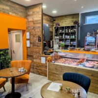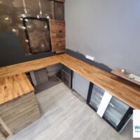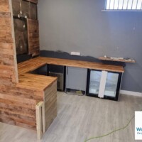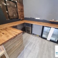 We reused as much of the original reclaimed cladding as possible and added new cladding behind and onto a completely new counter area, reusing the original display fridge in its new home. Solid oak worktops were installed throughout the new serving area to add warmth and quality.